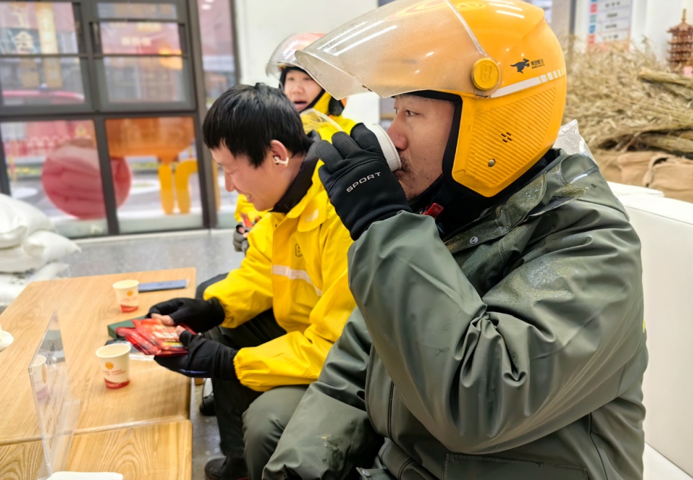 外卖员李保林忙完一单后走进驿站,抖落雨衣上的雪,坐下松了口气:“现在不管多晚,都能进来歇歇脚、充充电,真的很方便。”