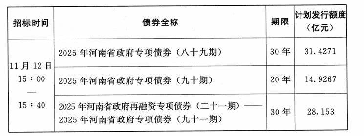 【大河财立方消息】11月5日,河南省财政厅公告,为支持我省经济和社会发展,根据财政部有关规定,经省人民政府同意,决定发行2025年河南省政府专项债券(八十九至九十期)、再融资专项债券(二十一期)。